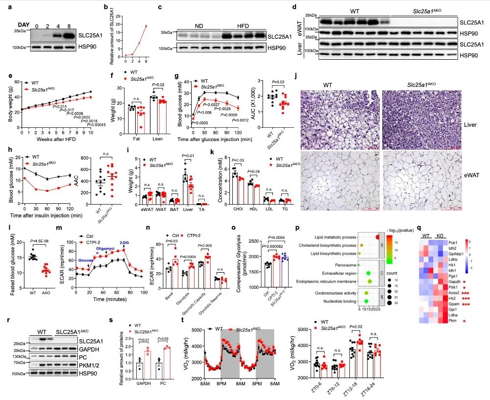 饮食限制(包括禁食、热量及营养素限制)在多种器官中诱导适应性代谢反应,有助于体重管理、延缓衰老并促进机体健康。在这些代谢益处中,饮食限制在恢复因营养过剩而受损的燃料转换(即代谢灵活性,Metabolic flexibility)方面显示出积极效果。尽管在啮齿动物研究中,饮食限制展现出积极一致的结果,但人类临床试验的结果确好坏参半,且受试者的依从性挑战进一步影响了这些研究的可靠性。因此,探索饮食限制带来代谢益处的分子机制,并开发能够复制这些有益效应的方法,有助于帮助对抗肥胖及其相关的心脏代谢并发症等。目前已发现若干关键信号通路和分子——例如胰岛素-AKT、FOXO、哺乳动物雷帕霉素靶蛋白(mTOR)、烟酰胺腺嘌呤二核苷酸(NAD⁺)、AMP激活蛋白激酶(AMPK)、成纤维细胞生长因子21(FGF21)以及昼夜节律——在介导饮食限制的抗肥胖效应中发挥着重要作用。在啮齿动物和人类研究中,减少必需氨基酸甲硫氨酸的摄入已被证明在防止体重增加和增强代谢方面尤为有效。此外,甲硫氨酸的代谢产物S-腺苷甲硫氨酸(SAMe)——作为体内甲基化的供体,在肝脏中的水平与体重指数呈正相关,并参与禁食诱导的代谢适应。并且,抑制肝脏中甲硫氨酸腺苷转移酶也显示出缓解饮食诱导的肥胖和代谢综合征的潜力。然而,由SAMe介导的底物甲基化如何影响肥胖,尤其是脂肪组织的肥胖及禁食反应,目前仍不清楚。2026年2月2日,苏州大学剑桥-苏大基因组资源中心贾志浩、张勇及剑桥大学Antonio Vidal-Puig课题组联合在《Nature Communications》杂志在线发表了题为“PRMT3-mediated post-translational adaptation to fasting regulates metabolic flexibility”的工作。该研究揭示了内脏白色脂肪组织中PRMT3介导的精氨酸甲基化修饰作为一种营养响应性调节机制,通过甲基化线粒体柠檬酸转运蛋白 SLC25A1 调节葡萄糖代谢,抑制该机制会改善肥胖状态下的代谢灵活性损伤,因而可能成为潜在的治疗靶点。贾志浩课题组多年来致力于PRMT家族在骨骼肌和脂肪发育与代谢调控中的研究:揭示了PRMT5调控白色脂肪细胞脂质储存和脂滴生成(Adv Sci 2020; iMetaOmics2025);PRMT5调控骨骼肌脂代谢和肌肉干细胞脂噬(EMBO Rep 2023; Cell Rep 2023)。在本研究中,研究人员聚焦应在不同营养状态下代谢器官中(肝脏、棕色脂肪组织和内脏白色脂肪组织)携带精氨酸甲基化修饰蛋白的表达变化。首先发现,在三种不同的精氨酸甲基化修饰类型中,ADMA(Asymmetric dimethylarginine,不对称二甲基精氨酸)在eWAT(epididymal white adipose tissue)中呈现明显的节律性表达(图一),与小鼠的摄食和RER的节律模式一致。而MMA(mono- methylarginine,单甲基精氨酸)和SDMA(symmetric dimethylarginine,对称二甲基精氨酸)并不存在节律性表达。且三种甲基化修饰类型在BAT和Liver均不存在节律。并且MMA和ADMA在饥饿后下调,再喂食后上调,且在肥胖/超重的小鼠eWAT/人vWAT中显著上调(图一)。这些结果表明,脂肪组织中MMA和ADMA水平升高与小鼠和人类的肥胖均相关,提示它们可能具有作为代谢生物标志物的潜力。图一不对称二甲基精氨酸化水平在内脏脂肪中随进食周期波动并在肥胖个体中积累随后通过筛选发现PRMT3组织特异性的参与饮食和肥胖相关的甲基化修饰:利用小分子抑制剂SGC707抑制PRMT3,可以有效逆转/预防高脂诱导的肥胖,并通过促进白色脂肪细胞糖代谢增强Metabolic flexibility(反映为ΔRER);抑制PRMT3可以模拟16:8限制性饮食的代谢益处(减重,提高ΔRER,图二)。图二SGC707处理小鼠可以模拟16:8限制性饮食的代谢益处通过靶向代谢组(麦特惠普)和代谢流分析表明,抑制PRMT3后白色脂肪组织中的柠檬酸(citrateacid)含量以及白色脂肪细胞中的同位素标记柠檬酸发生显著改变。随后的结果表明,线粒体柠檬酸转运蛋白SLC25A1是PRMT3的白色脂肪组织特异性甲基化底物:PRMT3通过甲基化SLC25A1的R282和R285调控其蛋白质的稳定性(图三);SLC25A1具有和PRMT3以及ADMA相同的表达模式(图四);脂肪细胞特异Slc25a1敲除抵抗高脂诱导的肥胖并促进脂肪细胞糖代谢(图五)。图三 PRMT3甲基化SLC25A1的R282和R285图四SLC25A1在eWAT中的昼夜表达模式受进食调控,并依赖胰岛素-pAKT信号通路图五Slc25a1敲除通过增强脂肪细胞的葡萄糖代谢抵抗高脂诱导的肥胖。苏州大学剑桥-苏大基因组资源中心的贾志浩、张勇,以及剑桥大学的Antonio Vidal-Puig为该论文的共同通讯作者,剑桥-苏大基因组资源中心张勇课题组的博士生黄正云为本论文第一作者。本研究受到科技创新-2030重大项目、国家自然科学基金、江苏省自然科学基金和姑苏领军人才等项目资助。