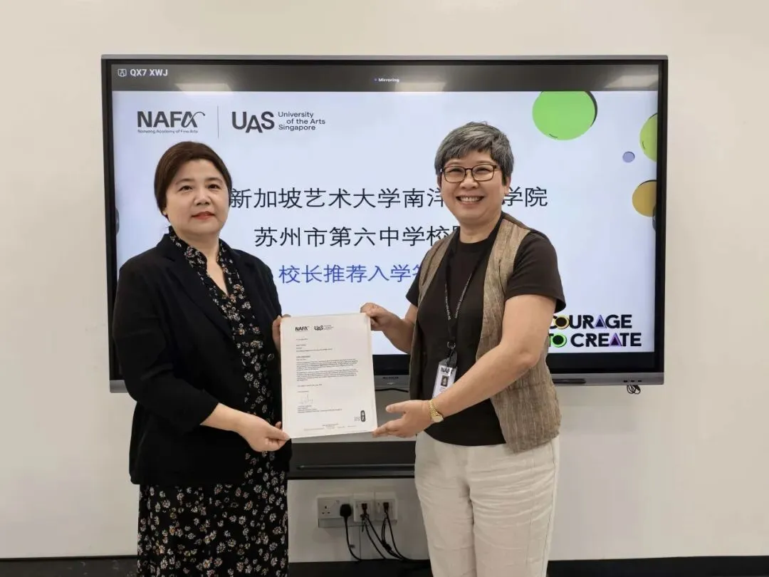 此次 “校长推荐制” 合作,是双方经过多轮深入沟通与互信考察后的重要成果。根据合约内容,未来苏州六中国际部符合条件的优秀学生,将可通过沈桂芳校长的推荐,直接获得新加坡艺术大学的专项申请通道 —— 在满足基本学术与艺术素养要求的前提下,推荐生可享受简化申请流程、优先参与校方面试评估等权益,大幅提升入读新加坡优质艺术院校的机会。这一合作不仅打破了传统留学申请的壁垒,更让我校学子在艺术升学道路上拥有了更具针对性、更高效的选择。