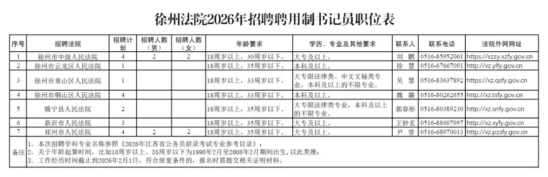附件:《徐州法院2026年招聘聘用制书记员职位表》