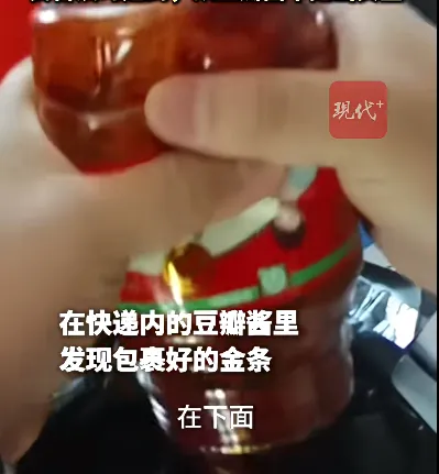 南京一名女子花费14多万元,购买了130克金条,用锡纸裹紧塞进豆瓣酱中要寄出。