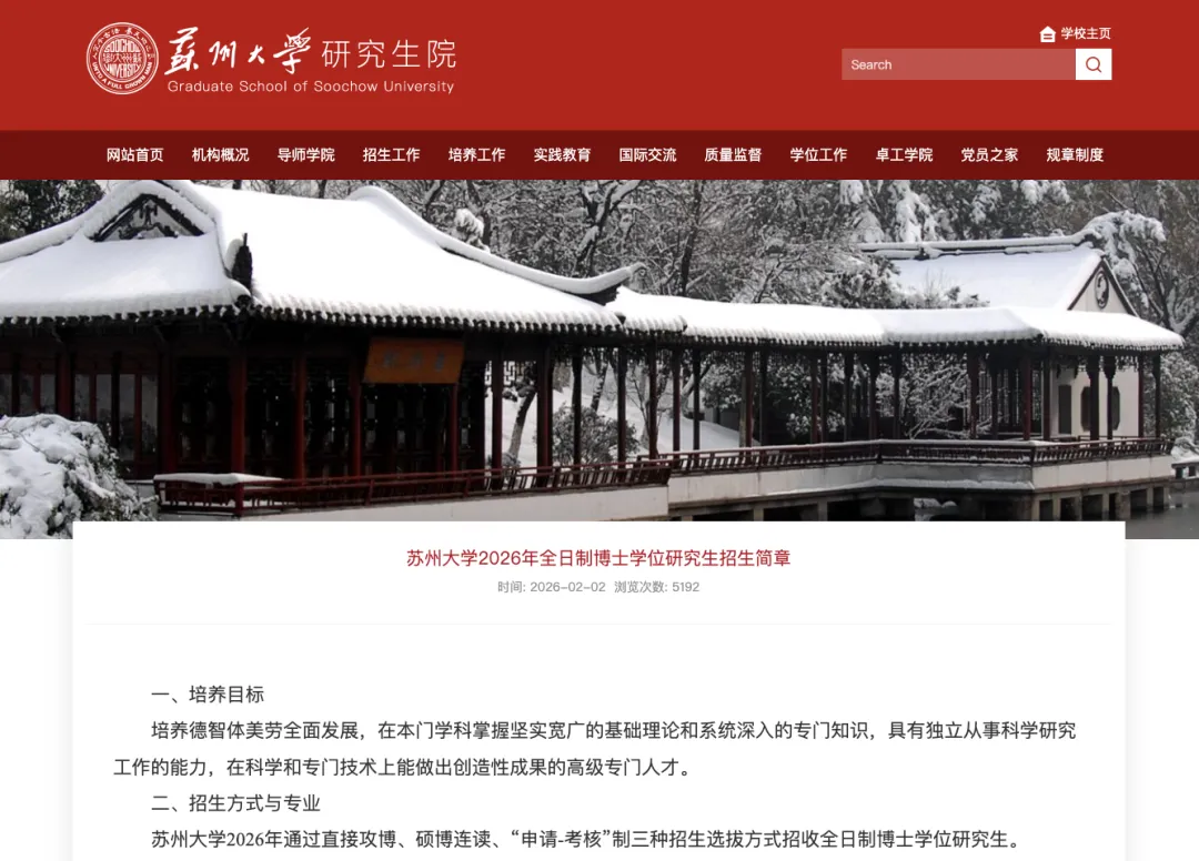 苏州大学2026年通过直接攻博、硕博连读、“申请-考核”制三种招生选拔方式招收全日制博士学位研究生。