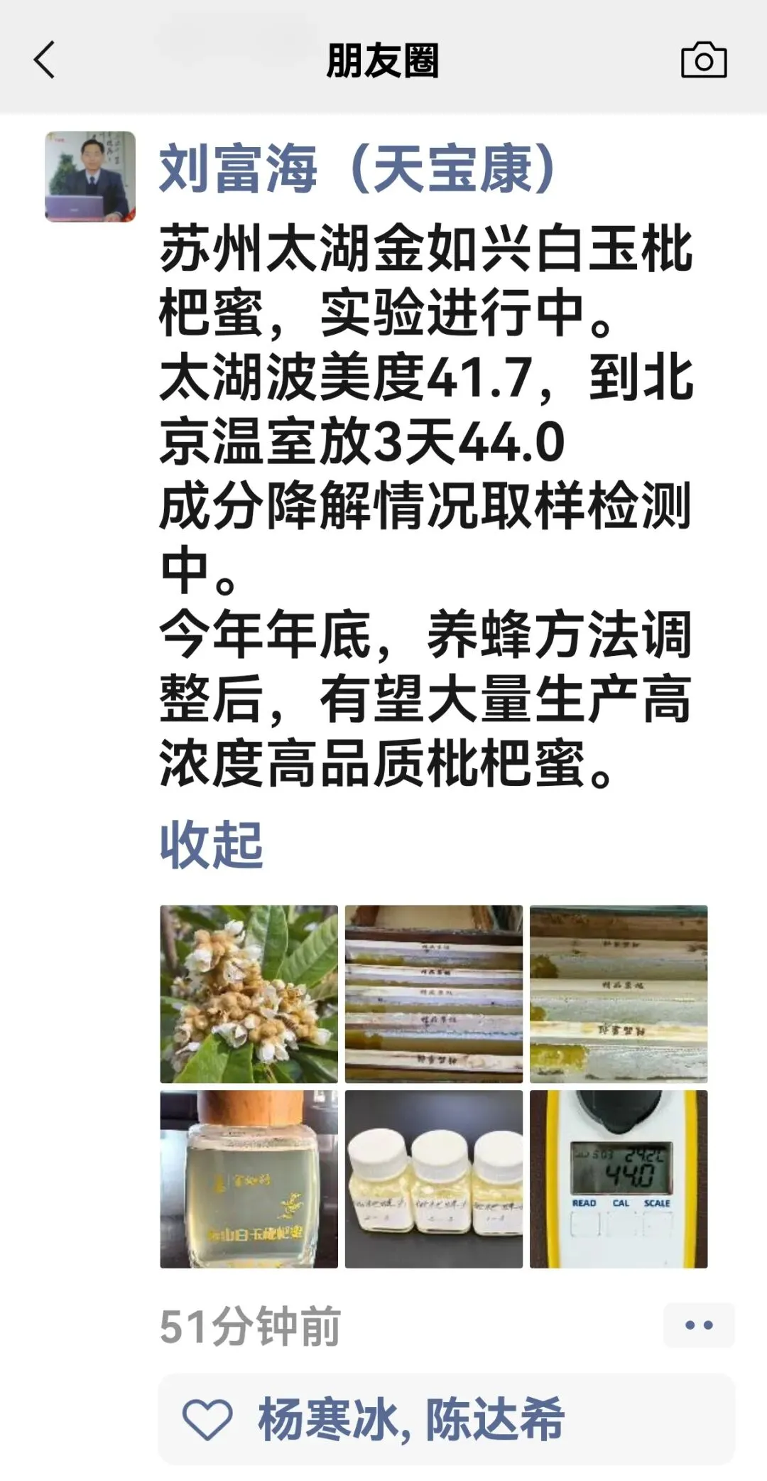 “宋心仿蜂业发展基金会”理事兼专家委员会委员、北京天宝康高新技术开发有限公司董事长刘富海的微信朋友圈里发布了以下信息:
