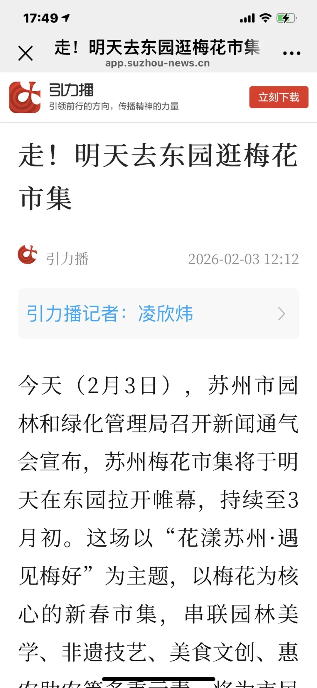 报道至2月1日苏州九大城门挂春联江苏开门红+苏州东园准备梅花市集花漾苏州梅开五福等;