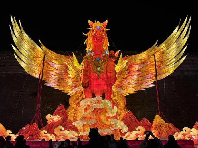 老门东明城墙下,15米高的“赤焰神骏耀金陵”生肖灯超有气势,30多处“马”主题灯组,搭配999盏福灯组成的光瀑,一到晚上亮起来,简直美翻了!这璀璨的灯火,就像咱们健康产业一样,蒸蒸日上、越做越火。