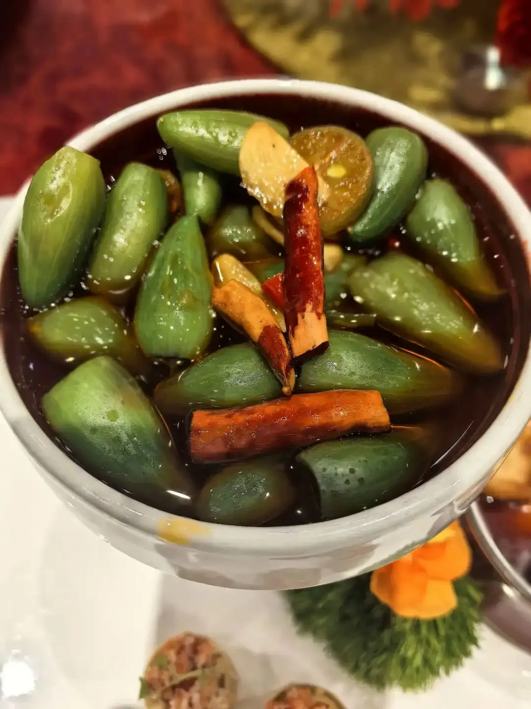 在图片中,可以看到腊八蒜被放置在一个碗中,旁边还搭配了一些香料,如桂皮等,进一步提升了其风味。这种食品常在春节期间作为配菜食用,尤其适合搭配饺子等传统节日食品。