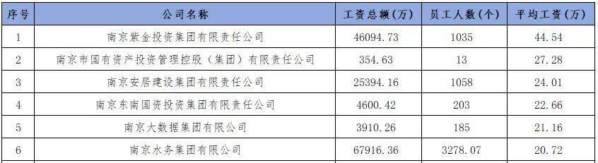 南京紫金投资集团为南京市属金融投资集团,其2024年度工资总额为46094.73万元,在岗职工年平均工资高达44.54万元(2023年度人均工资为45.12万元),人均工资在市属国企中一骑绝尘,远超其他企业。