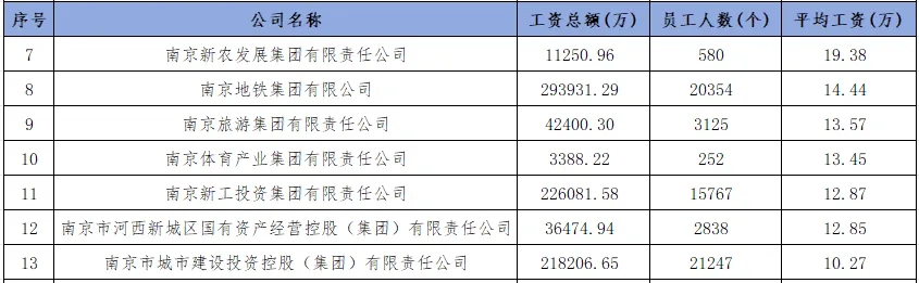 南京市河西新城区国有资产经营控股(集团)和南京市城市建设投资控股(集团)2024年度在岗职工年平均工资分别为12.85万元和10.27万元;2023年度人均工资分别为12.94万元和10万元。