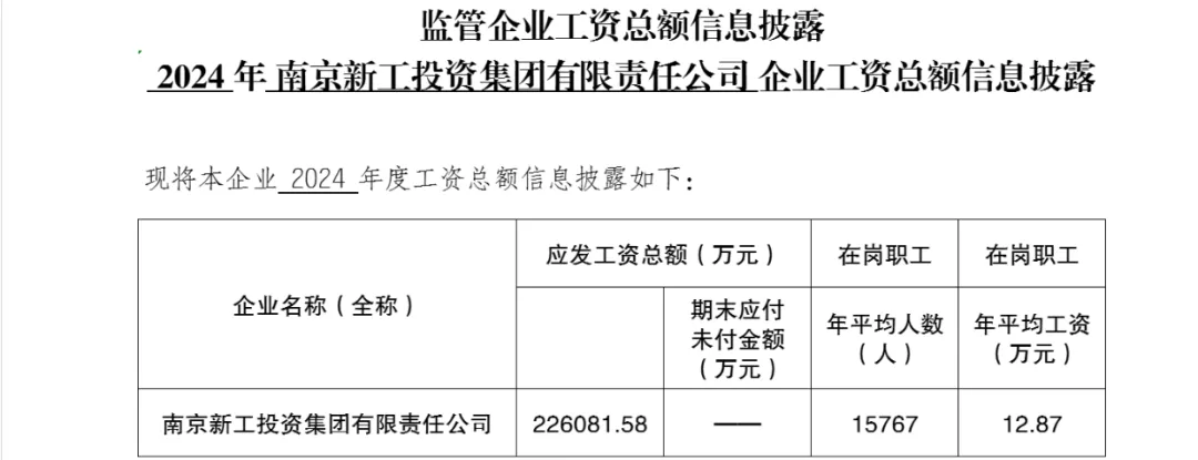 南京新工投资集团2024年度工资总额为226081.58万元,在岗职工年平均工资为12.87万元(2023年度人均工资为12.87万元)。