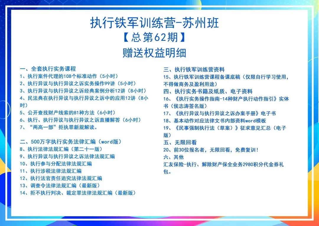 活动时间:2026年3月14-15日【2天1夜】 活动地点:苏州 报名权益:定价3980元,超值钜惠2980元/人,买1送20,得21 61期更新迭代,系统+方法 实战+工具塑造执行办案思维,提升执行实务操作能力,掌握执行全流程办理方法。