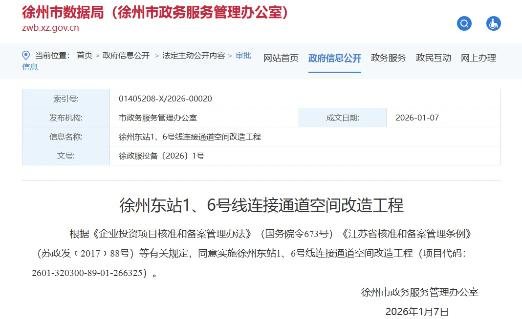 近日,徐州市数据局(徐州市政务服务管理办公室)发布《徐州东站1、6号线连接通道空间改造工程》称:根据《企业投资项目核准和备案管理办法》(国务院令673号)《江苏省核准和备案管理条例》(苏政发﹝2017﹞88号)等有关规定,同意实施徐州东站1、6号线连接通道空间改造工程(项目代码:2601-320300-89-01-266325)。目前,徐州东站地铁1、6号线换乘面临先出站再入站的尴尬困境,换乘时间较长,此次空间改造将为换乘带来改善。