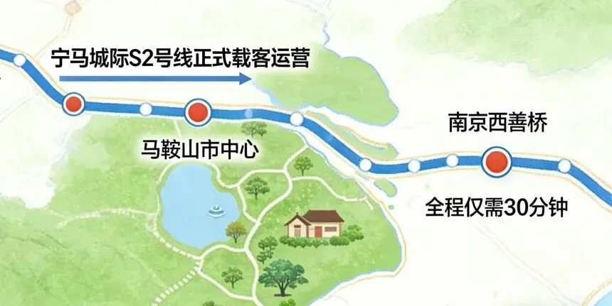 2026年上半年,宁马城际S2号线正式载客运营,从马鞍山市中心到南京西善桥仅需30分钟。
