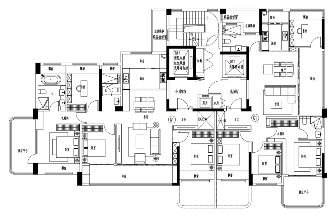 项目1号楼有建面约155㎡A1(左)与建面约135㎡C1(右)两种户型: