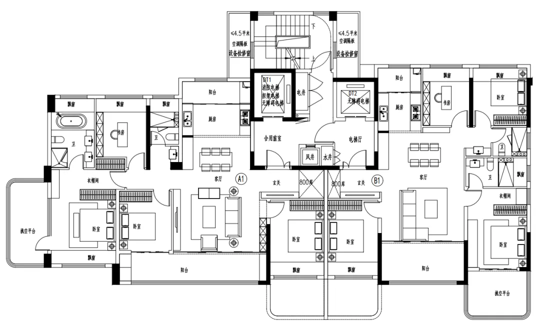 2号楼有建面约155㎡A1(左)与建面约135㎡B1(右)两种户型: