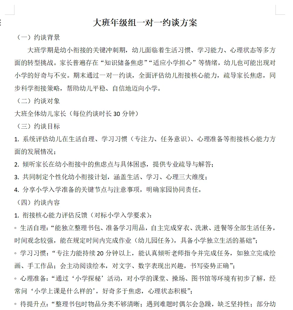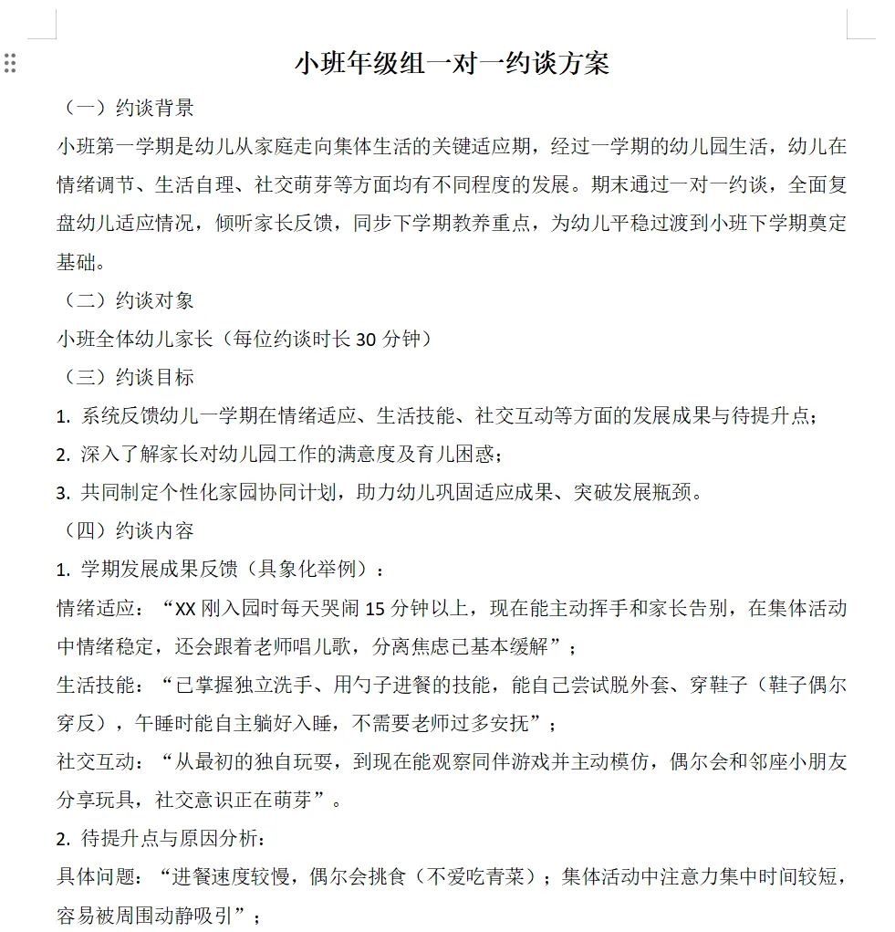 活动开展前,各班教师秉持严谨负责的态度,对每位幼儿在园综合表现进行了全面梳理与深度分析。从活动参与、游戏互动到生活自理、同伴交往等多个维度,精准捕捉幼儿的优势与发展需求,量身定制个性化约谈方案。同时,教师们提前通过班级群、电话等方式发布邀约,明确访谈时间、地点及核心议题,让家长做好充分准备,确保访谈“有备而访、用心而谈”。