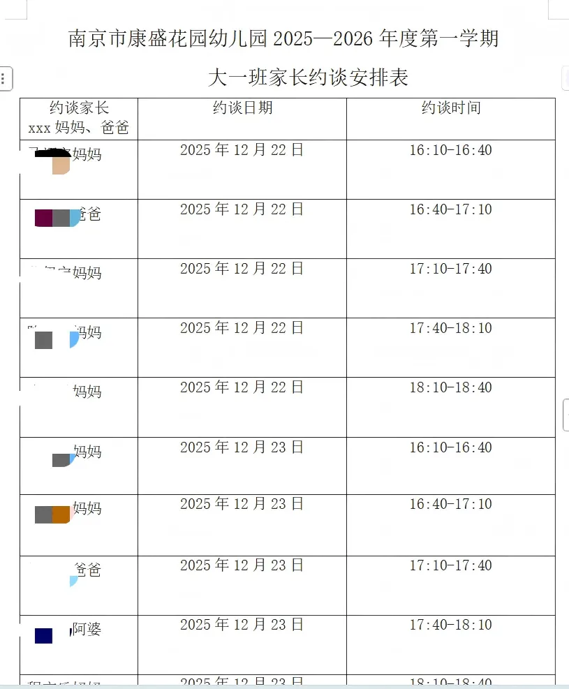 此次期末家长预约访谈活动,不仅有效拉近了家园距离,更构建了相互理解、彼此信任、家园共育共同体。未来,康盛园将继续以爱为桥、以心为引,深化家园沟通与合作,创新共育形式,让家园共育更有温度、深度与力度,与家长携手同行,为每一位幼儿的健康、快乐、全面成长保驾护航!