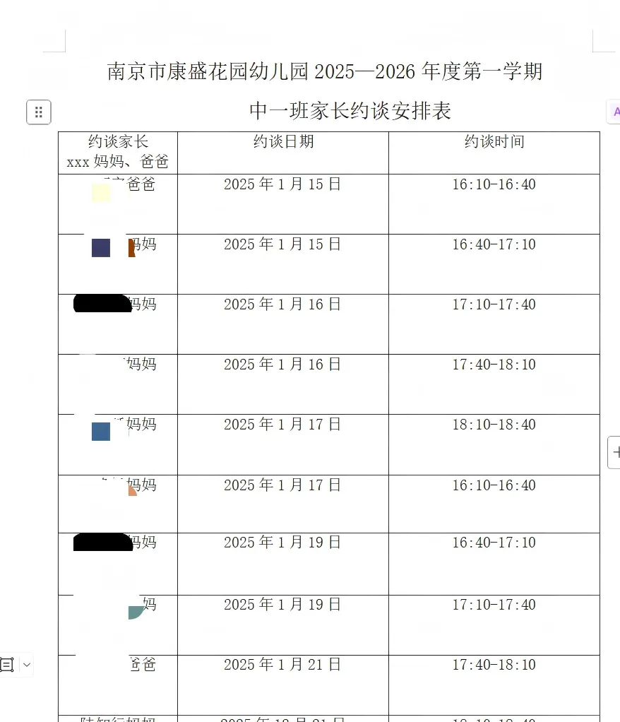 时光为笺,爱为笔墨,家园是孩子成长路上最温暖的同盟。为进一步筑牢家园沟通的坚实桥梁,凝聚家园教育合力,让家长全面、深入地了解孩子在幼儿园的生活、学习与发展状况,同时针对不同年龄段幼儿的成长特点提供精准指导,2026年1月,南京市康盛花园幼儿园精心策划并开展了以 “家园同心话成长,携手共育向未来” 为主题的期末家长预约访谈活动,为家园共育注入温暖力量。
