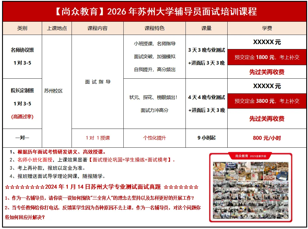 面试按照我校制定的面试办法执行。面试方式将在苏州大学人力资源处网站(http://rsc.suda.edu.cn/,招聘信息-专职辅导员栏)上发布通知,没有按照规定的时间和地点参加面试的人员视为主动放弃。面试主要测试履行岗位职责所需的专业知识、业务能力和综合素质。面试成绩总分为100分,合格线为70分(低于70分不予聘用)。面试成绩现场通知应聘人员。