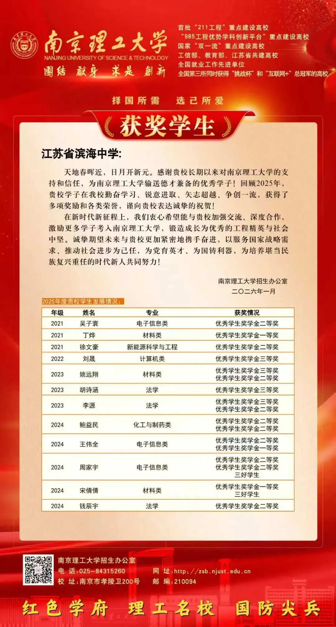 南京理工大学向我校发来喜报,感谢我校长期以来的支持和信任,输送了一大批德才兼备的优秀学子。回顾2025年,我校众多优秀毕业生在南京理工大学勤奋学习、锐意进取、矢志超越、争创一流,获得了多项奖励和各类荣誉。在新时代新征程上,希望两校能继续加强交流、深度合作,激励更多学子考入南京理工大学,锻造成长为优秀的工程精英与社会中坚。诚挚期望未来双方更加紧密携手奋进,以服务国家战略需求、推动社会进步为己任,为党育英才、为国铸利器,为培养堪当民族复兴重任的时代新人共同努力!