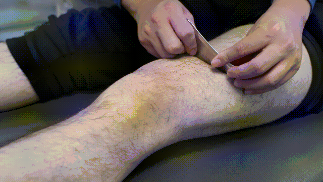 身体总是对突然的刺激产生应激反应,所以第一步最好做一些预处理使身体产生必要的顺应性。比如轻手法进行揉、捏等等,亦或用热毛巾热敷促进适用与放松、或使用预热过的探刀进行缓慢大面轻柔多方向松解。