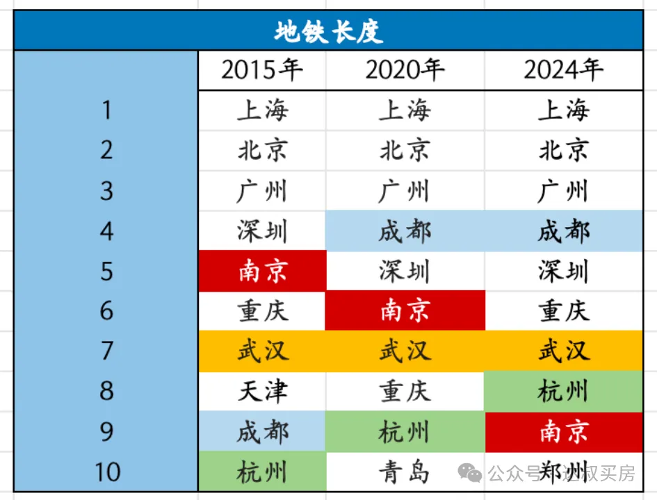 南京地铁曾经排进前5,后10年,发展速度不够快,现在还能算第9。