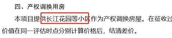本项目提供长江花园等小区作为产权调换房屋。在征收过程中如有变化,根据实际情况再行调整。用于产权调换房屋的价值和被征收房屋价值在同一评估时点分别计算价格后,结清差价。