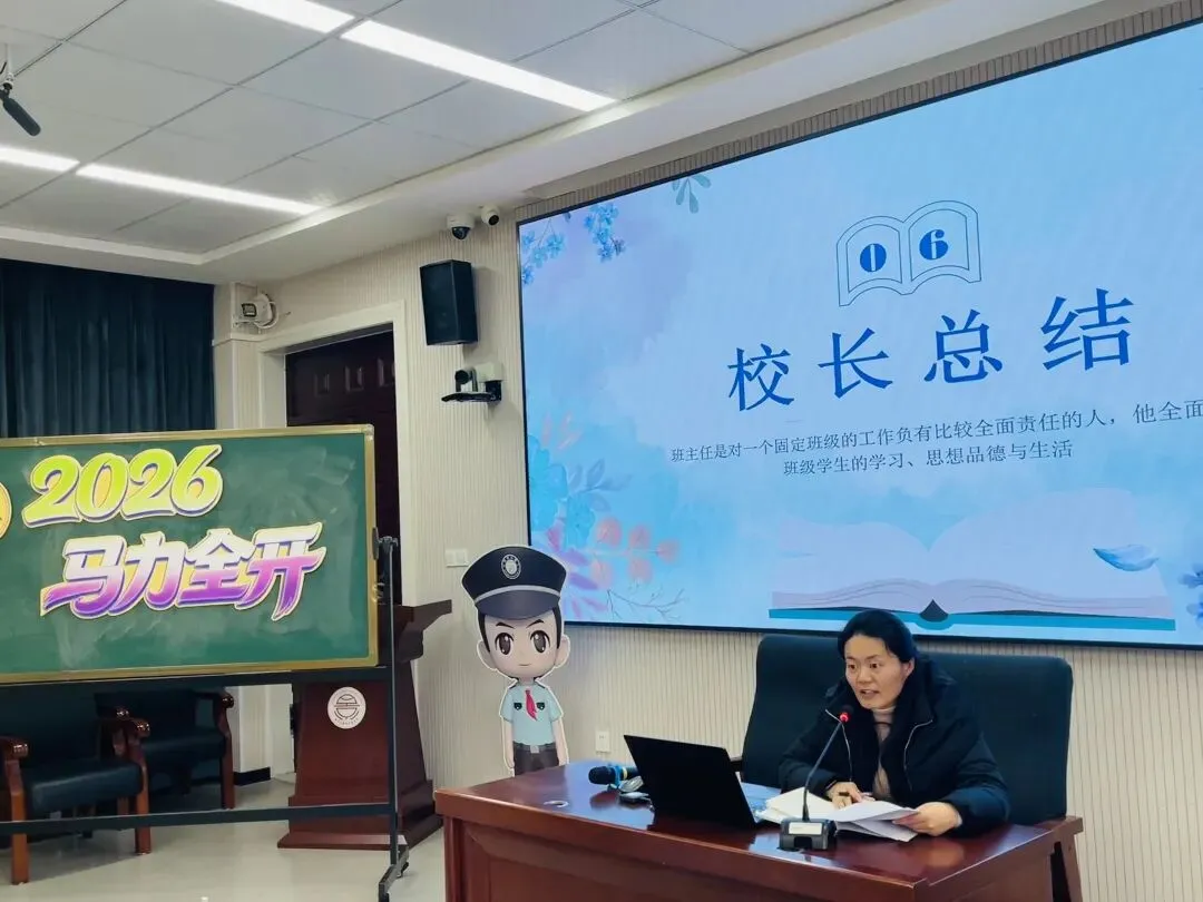会议最后,学校德育副校长孟颖作总结讲话。她首先感谢全体班主任一学期来的默默耕耘与无私奉献,并结合学校发展大局,对下学期德育工作的重点方向与核心任务进行了宏观部署与动员。孟校长强调,班主任是学校德育工作的中坚力量,希望全体班主任继续秉持育人初心,强化责任担当,不断提升专业素养与育人能力,携手推动学校德育工作再上新台阶。