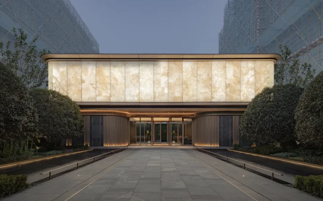 为了将大门归家的尊崇感更好的体现,在主入口,璟樾府选用了大量的古檀木纹光面奢石和蓝翡翠奢石,在白天与黑夜中能呈现出不同的光感,自带神秘格调。