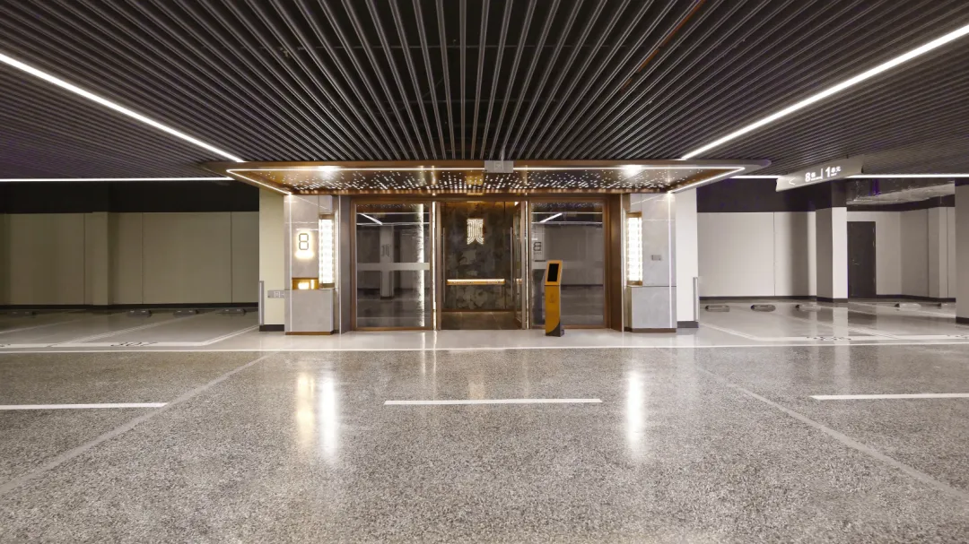 在璟樾府,精选十多种天然奢石,你能看到流沙棕奢石墙面、范思哲黑奢石吧台,就连脚底下踩着的,都是安哥拉黑和夜里雪石材。值得重点一提的是,璟樾府的地下车库运用了水磨石+星空顶,要知道水磨石比一般车库的材料更具抗腐蚀、防滑性能,但成本也更高昂,因此主要针对的是高端项目、追求长效性与美观并重的客户。