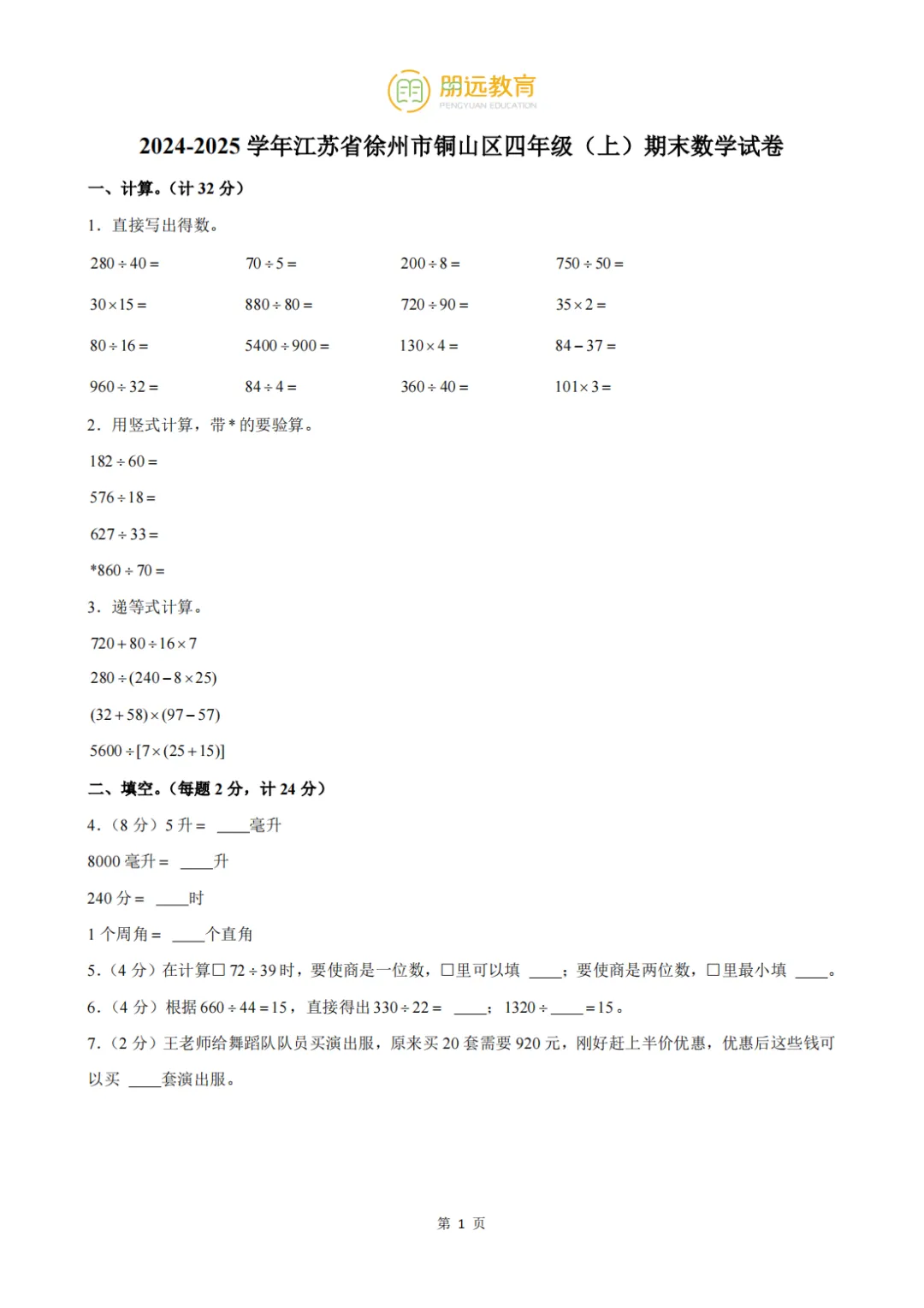 >2024-2025 学年江苏省徐州市铜山区四年级(上)期末数学试卷