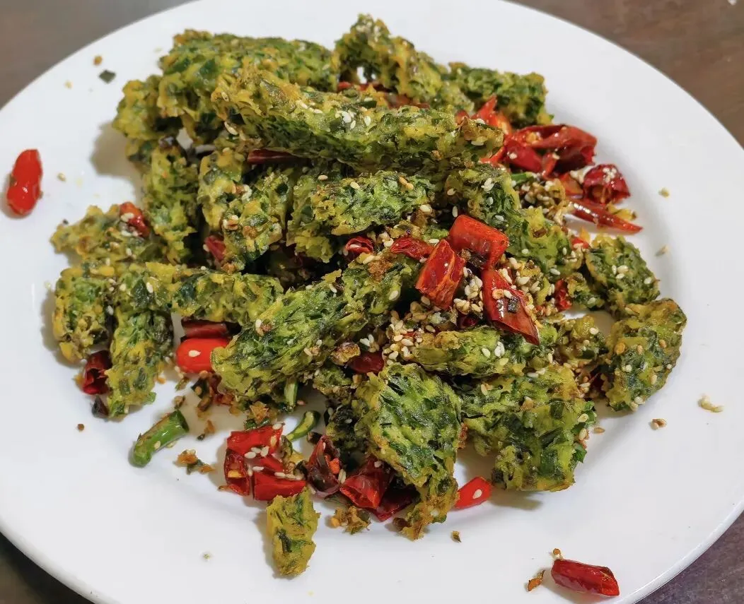韭菜饼是切条重新炸的,口感酥脆,满满的韭菜香味,整体很不错。