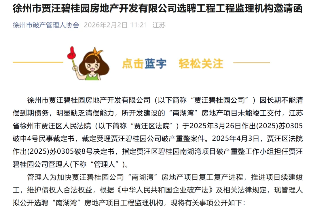 2025年3月,贾汪区法院裁定受理贾汪碧桂园公司破产重整案件,当年4月指定专门的破产重整工作小组担任管理人,筹备推进项目复工复产。如今终于进入实质推进阶段,公开选聘监理机构,就是将要确保续建工程的施工质量。