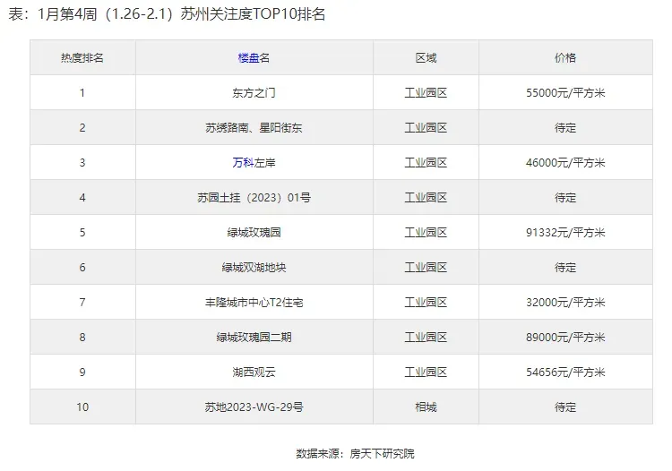 1月第4周(1.26-2.1)苏州热搜楼盘排行榜出炉。