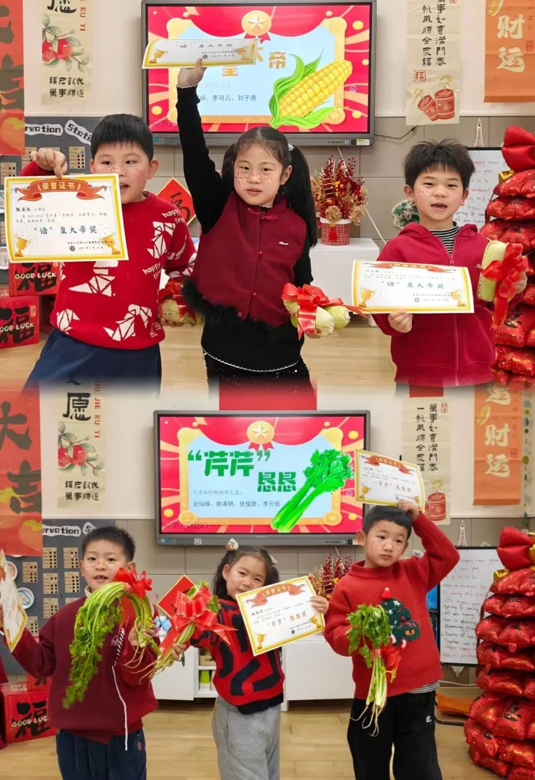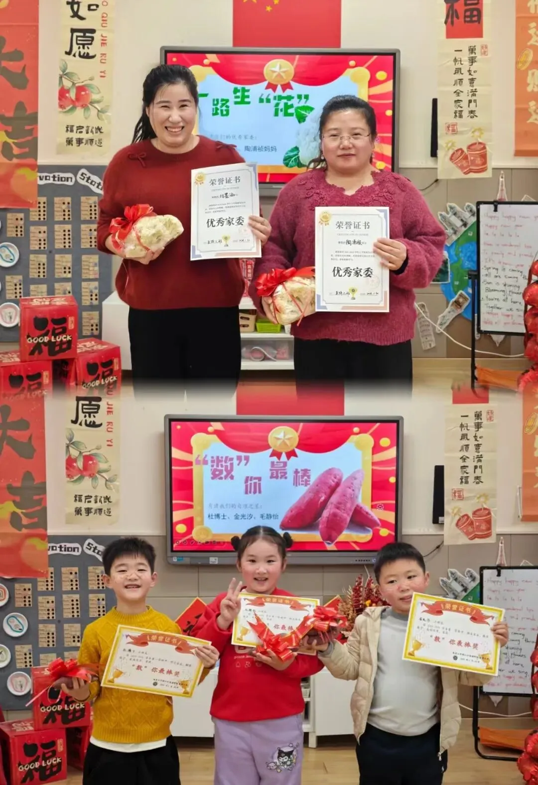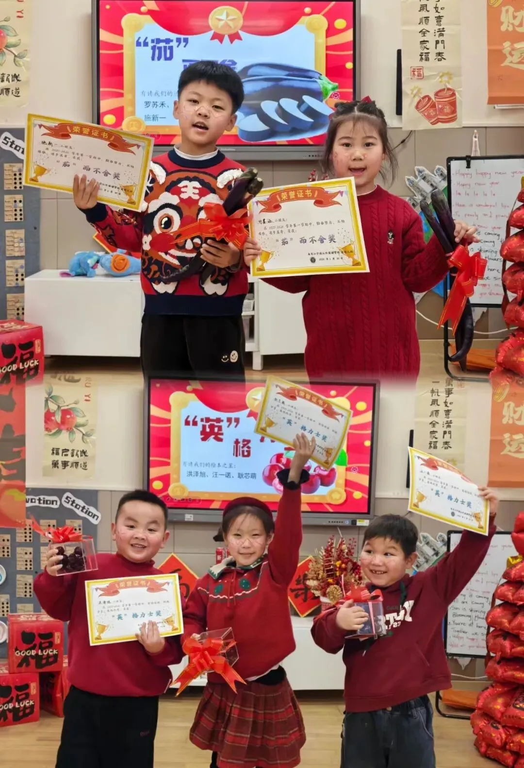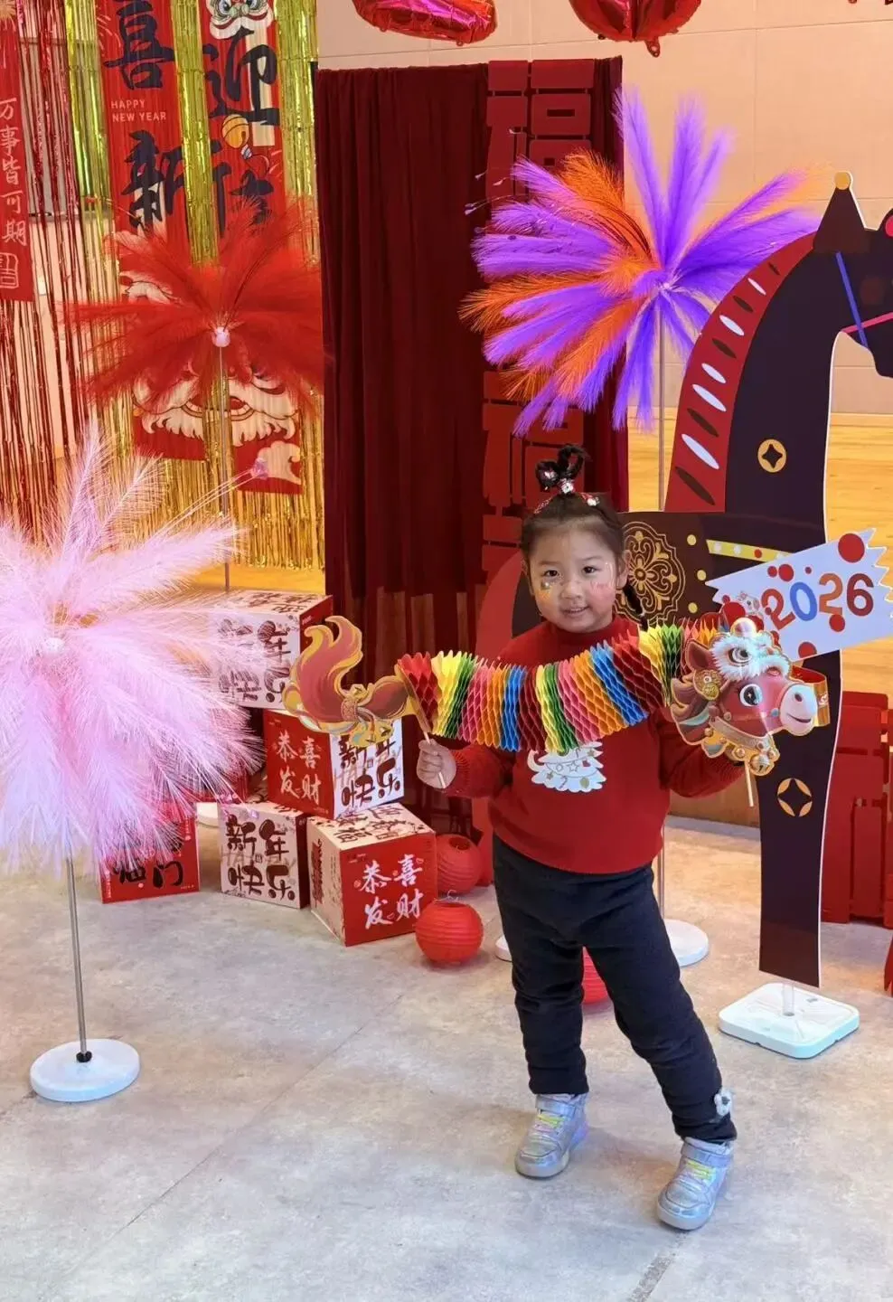 大一班的“快乐小马”们以一场充满趣味的散学式,为学期生活收尾!成语猜谜环节妙趣横生,孩子们开动小脑筋,在“一马当先”“马到成功”等寓意美好的谜题中,感受传统文化的魅力,现场答题声、欢呼声此起彼伏。新年茶话会上,宝贝们围坐一堂,分享甜蜜零食与校园趣事,在欢声笑语中提前感受新春的喜气洋洋。亲子手工时间温情满满,家长与宝贝携手制作“红果果发财桶”,将红火火的好运与满满的祝福亲手装回家。压轴的颁奖礼上,每一张奖状都是对孩子们一学期努力的肯定,为成长盖上骄傲的印章。愿大一班的宝贝们带着这份温暖,自信奔赴新学期!
