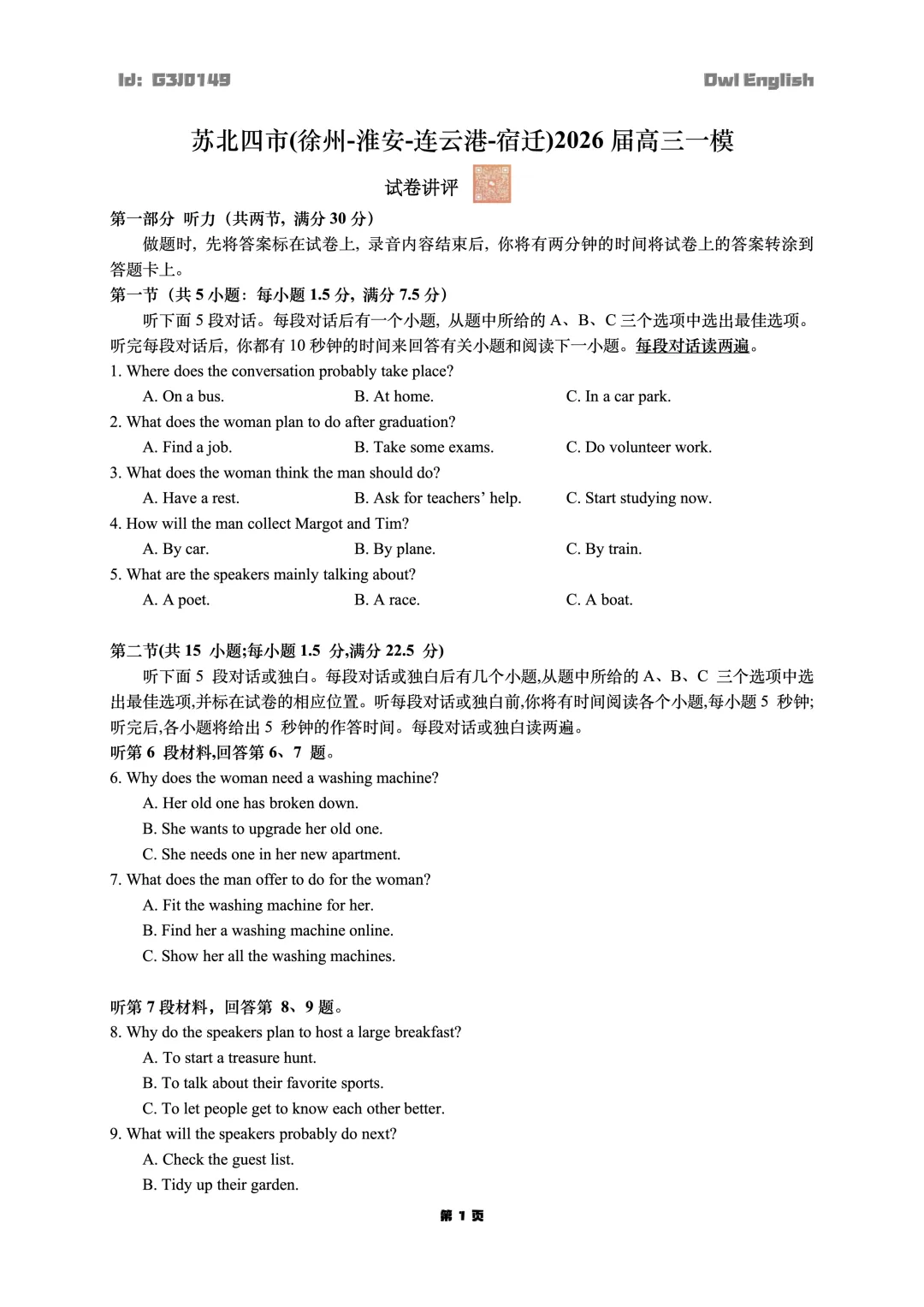 【一模】苏北四市(徐州-淮安-连云港-宿迁)2026届高三一模