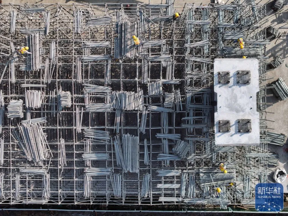 2月3日,中铁建城通公司工人进行盘扣支架搭设(无人机照片)。