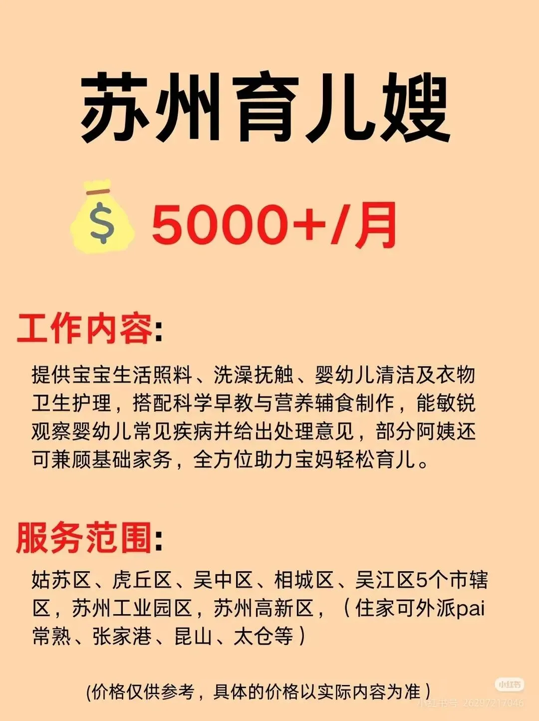 💛月薪5000+,服务覆盖姑苏区、虎丘区、吴中区、相城区、吴江区,以及苏州工业园区、高新区,住家还可外派至常熟、张家港、昆山、太仓等地。