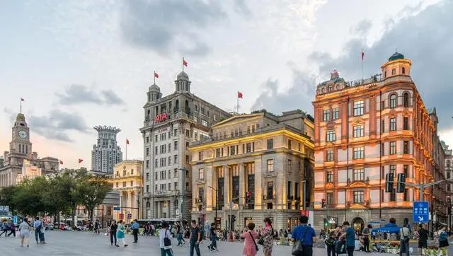 图中这一排洋房叫外滩万国建筑群,墙面是沉稳的石色,窗楣上有卷叶纹,旗杆上小红旗迎风摆,夕阳一过,灯线一亮,立面像抹了金粉,外沿的花坛常有人坐着吃雪糕,爷爷说这些房子看起来讲究,其实最讲究的是比例,现在对岸高楼林立,外滩还是这条气度,站住就能听见历史说话。
