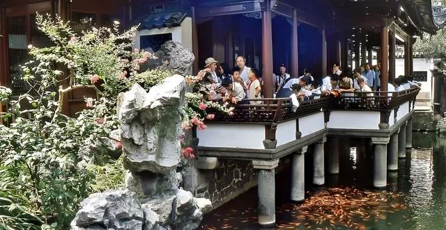 图里的园林叫豫园,回廊曲桥挨着水面,瓦当是乌黑的,栏板上摸着滑溜溜,桥下锦鲤挤成一团,游客伏在栏上撒面包渣,嗞啦一下就抢光了,奶奶说春天去豫园闻海棠,秋天看桂子,四季各有门道,现在园里人更多了,景致还是老景致,转个弯就能撞见一段旧时光。