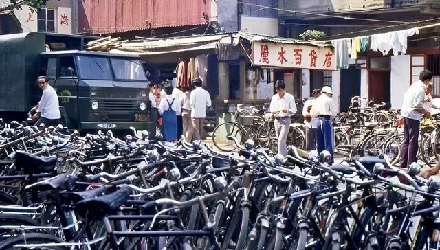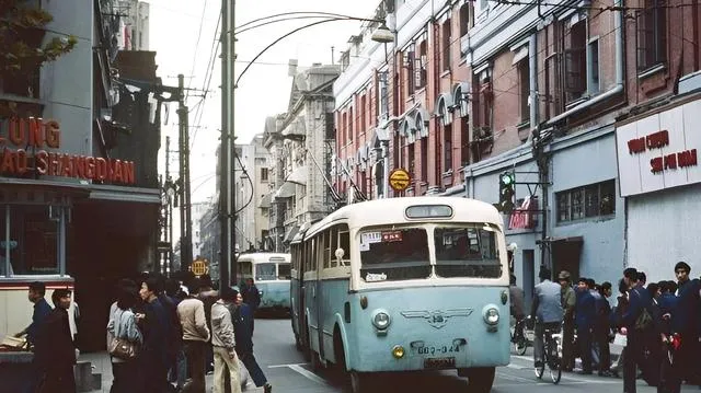 这个热闹场景叫南京路步行段雏形,图里20路无轨电车一头扎进人海,银灰车身上连着两根集电杆,哧啦哧啦擦着电网走,路两边牌匾排得密密匝匝,招牌灯白天都亮着,妈妈说逛南京路要从第一百货开头,一家一家看过去才算过足瘾,现在商场层层叠叠更多了,人还是多,可那种挤在护栏边听售货员吆喝的劲头少了点。