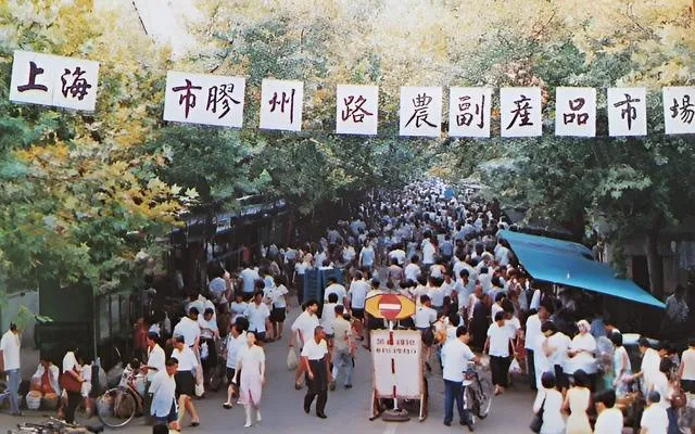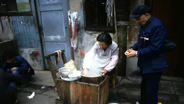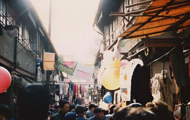 图中这条挤挤的巷子叫里弄集市,头顶拉着彩气球,衣裳晾在竹竿上,灶气味从窗缝里往外钻,小贩一边翻生煎一边招呼,阿姨说一毛五一个的茶叶蛋香得要命,现在外卖一按就到,热闹更快,烟火味却要从记忆里翻出来。