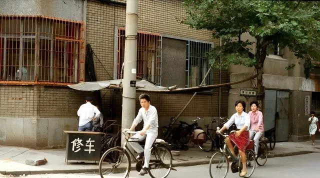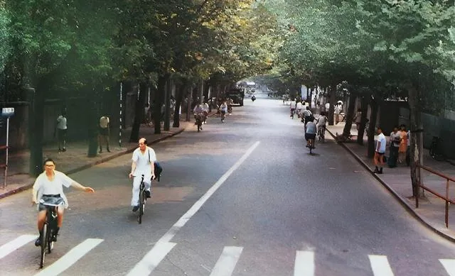 这个画面里的主角还是电车,队伍一串串开过去,路边栏杆分出人流和车流,钟表店的墙钟滴答走,夏天衬衫全是汗印,阿姨边走边扇蒲扇,现在空调冷风一开,谁还带扇子出门呢。