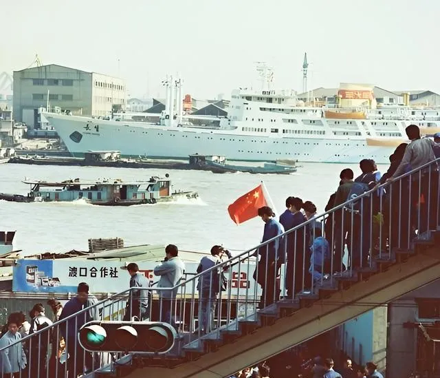 图中这道梯子叫过江天桥,人流一股股往上涌,栏杆边有小旗在风里猎猎响,江面拖轮顶着浪,奶奶说下班高峰时分你别跟人挤,站高一点慢慢走,现在过江靠地铁,天桥还在,踩上两步,回忆就跟着上来了。