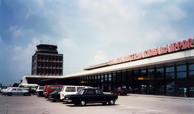 这个低矮长条叫老虹桥航站楼,玻璃幕墙映着云影,停机坪前排着方头方脑的轿车,门口人倒不多,爸说当年坐飞机得穿最好看的衣服,现在航班密密匝匝,机场像不夜城,想到那时候等一班机的安静,反倒有点稀罕。