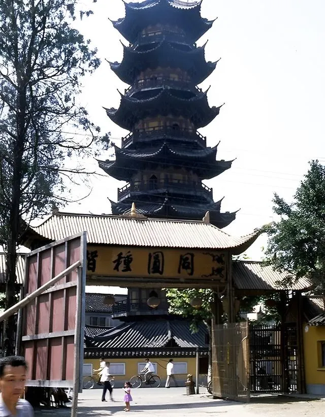 图中塔身叫龙华塔,七层檐角翘起,风一吹就“叮铃”轻响,寺门前人来人往,香火绕着树,奶奶合掌念一句,拉我说别闹,心要静一点,现在周边高楼映着塔影,新旧掺着看,更显古意。
