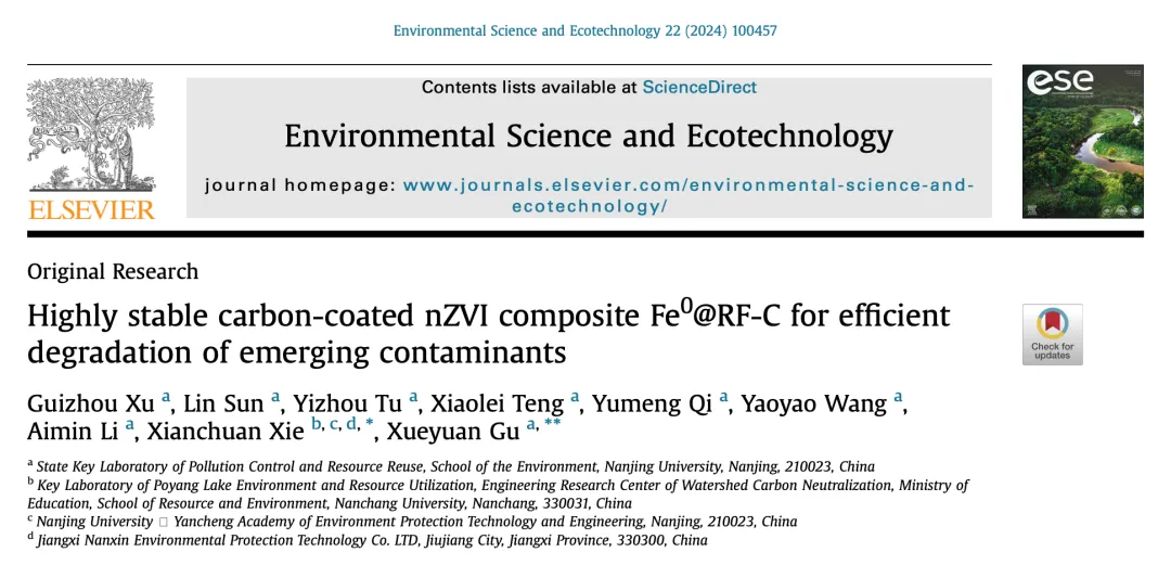Xu, G., Sun, L., Tu, Y., Teng, X., Qi, Y., Wang, Y., ... & Gu, X. (2024). Highly stable carbon-coated nZVI composite Fe0@ RF-C for efficient degradation of emerging contaminants. Environmental Science and Ecotechnology 22: 100457.