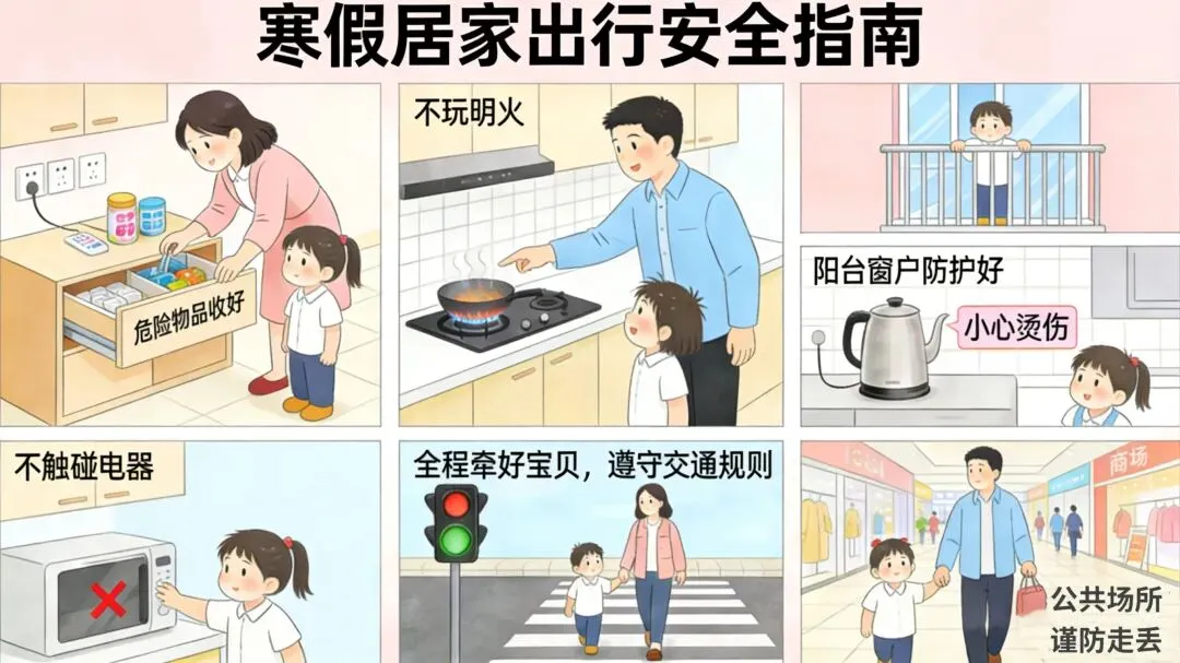 家长朋友应收好家里的插座、刀具、药品等危险物品,教育孩子不玩明火、不触碰电器,做好阳台、窗户防护,谨防坠楼、烫伤等意外。外出时全程牵好宝贝,遵守交通规则;公共场所谨防走丢。