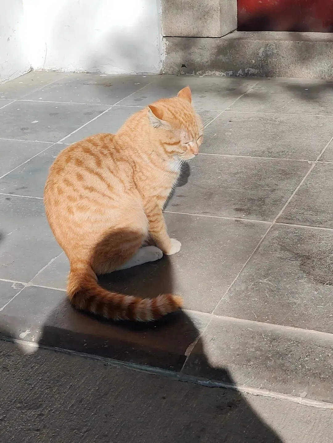 吃完面开始闲逛,草丛里、小桥边都有各种不同花色的猫咪,很亲人。走过曲径,有不少人在点香抄经,朋友带我去找四百岁的班鳖,真遗憾,只看到了它的铜像,原来是已经不在了。