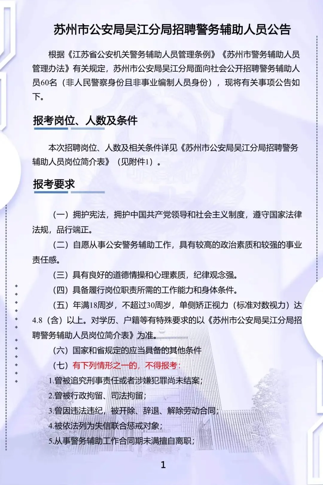 【苏州招聘】苏州市公安局吴江分局招聘