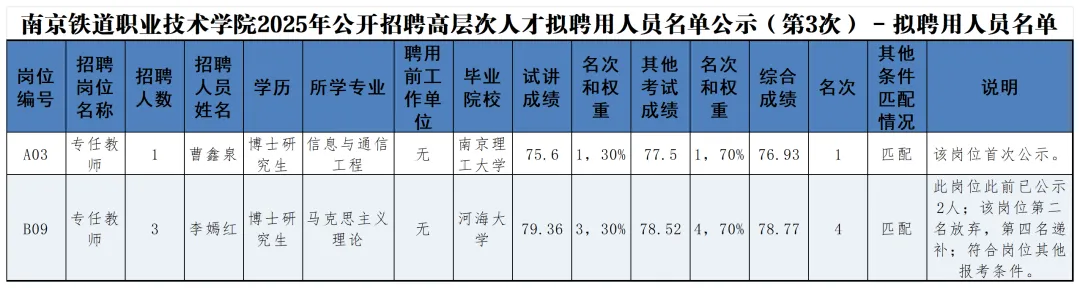 南京铁道职业技术学院2025年公开招聘高层次人才拟聘用人员名单公示(第3次)