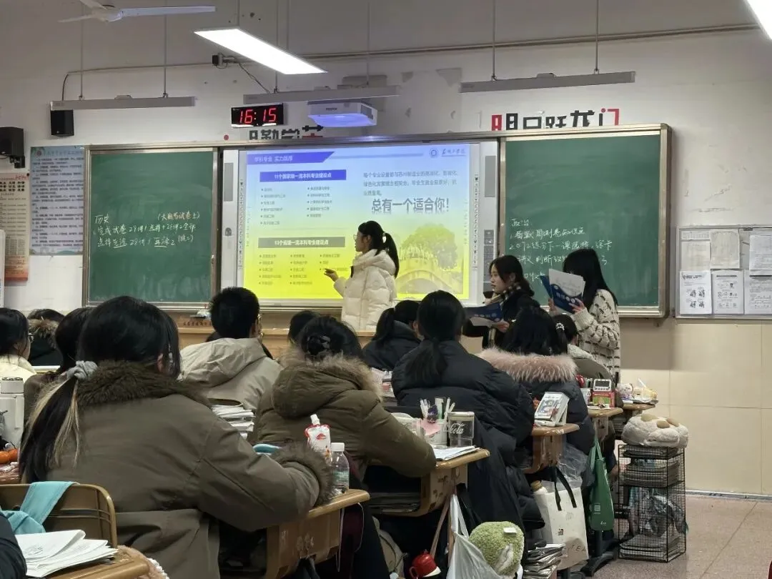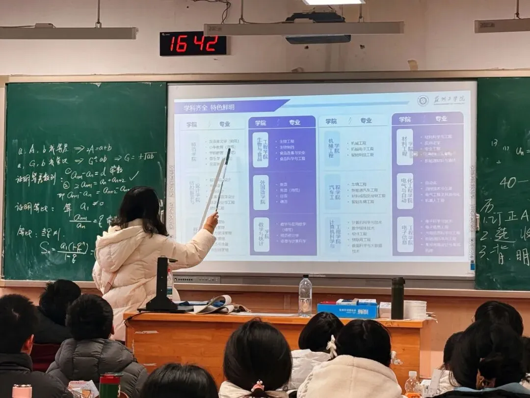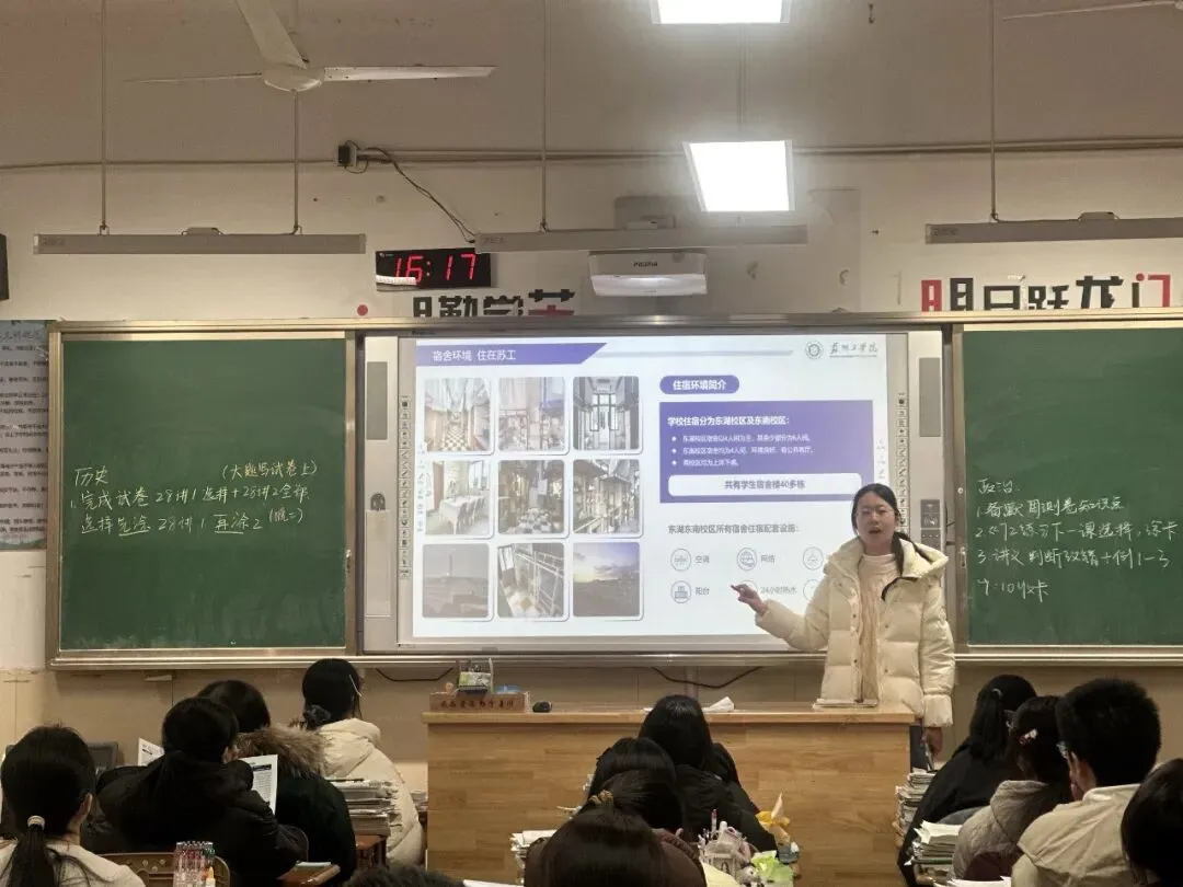 宣讲结束时,晚霞已铺满校园,熟悉的景致在暮色里格外温柔。这场母校行,不只是一次招生宣传,更是一场青春的接力——我们把苏工的鲜活日常、温暖氛围传递给了学弟学妹,也在分享中重新读懂了“传承”的分量。愿这短短一堂课的分享,能成为他们备考路上的一点微光;更期待不久的将来,能在苏工的道上,与这些满怀憧憬的少年们相遇。